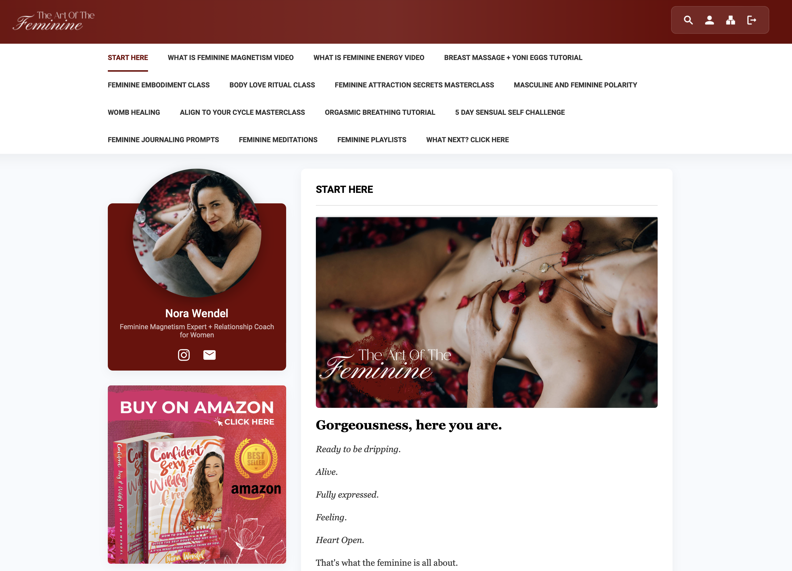 The Art Of The Feminine membership portal contains 14 modules of deep-dive content all around welcoming your feminine essence. Masterclass workshops on what is feminine energy, how masculine and feminine energy work in polarity, embodiment practices such as breast massage and sensual movement as well as yum feminine playlists and tons of journaling questions!